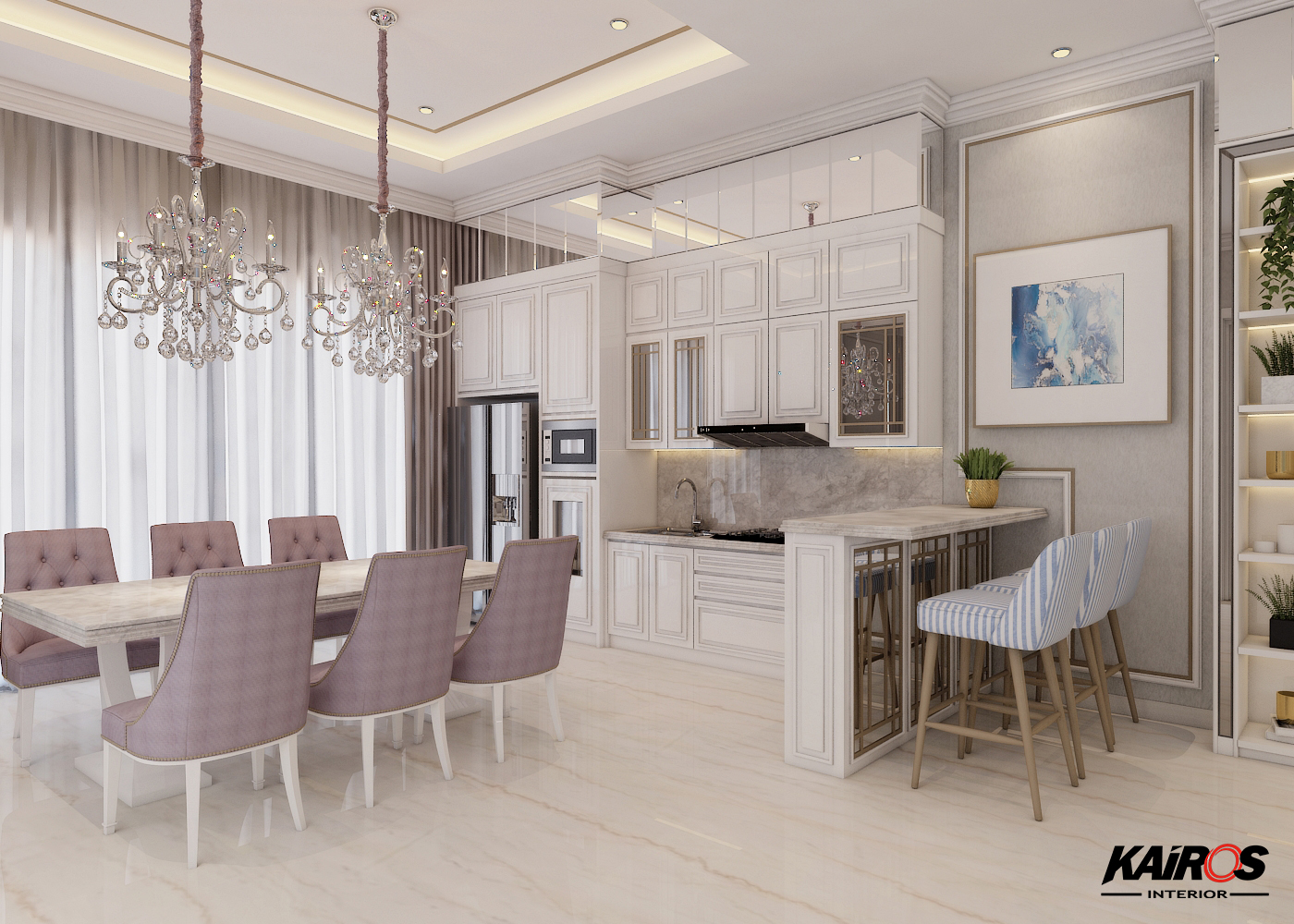 Warna putih cocok untuk area pantry memberikan tampilan timeless. Bisa dikombinasikan dengan aksen gold agar tampilan lebih mewah.